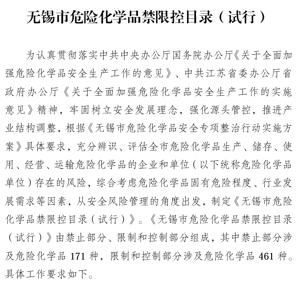 其次各地政策存在些許差異,部分地區(qū)對?;C經營范圍有所限制,就比如無錫市發(fā)布的《無錫市危險化學品禁控目錄(試行)》